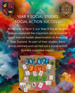 At the end of Term 3, our Year 9 Social Studies classes explored the important social issue of youth mental health deterioration in Aotearoa New Zealand. As part of their studies, each group planned and carried out a social action to make a positive impact.